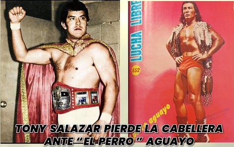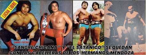1982: Sangre Chicana and El Satánico defeat Los Hermanos Mendoza (Ringo & Cachorro) in a hair vs. hair match (May 28). This win sparks a feud between Sangre and Satánico resulting in Satánico taking Sangre Chicana’s hair. Pánico and Manuel Robles face off in a mask and hair vs. mask and hair match against El Faisán and Franco Colombo (Aug. 17). The match has two disputed finishes and the wrestling commission later orders all four wrestlers to lose their hair and masks. El Santo bids farewell teaming with Gran Hamada to defeat Villano I and El Scorpio, saving their masks and hair during EMLL’s 49th anniversary celebration (Sept. 5). As part of the independent invasion, Tony Salazar loses his hair to Perro Aguayo.